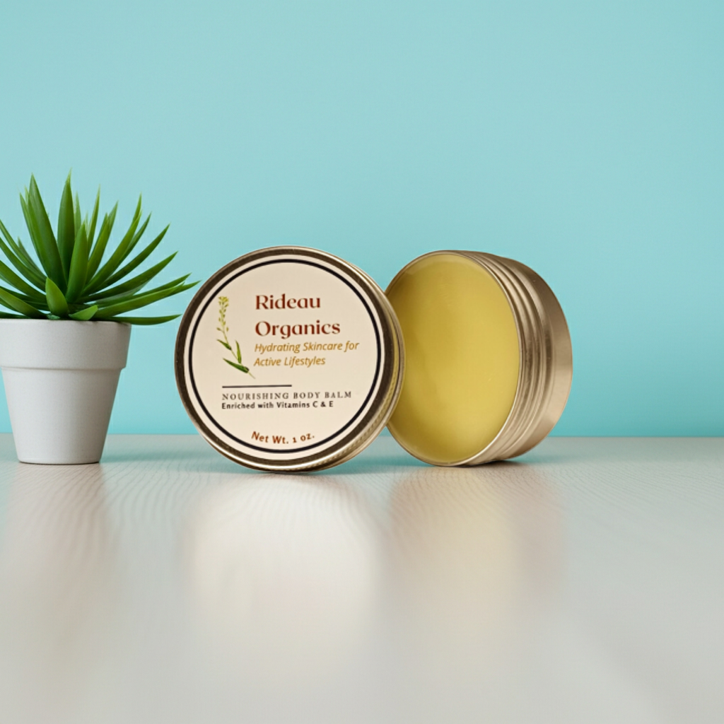 - When lotion isn't enough to keep skin moisturized, this potent formulation hydrates hands and dry skin fast. Lotions have a high water content that washes off quickly. Rideau Organics Nourishing Body Balm has a concentrated plant-based formula with Vitamin C & E oils to repair skin cells and maintain skin moisture longer than lotion. The combination of Camelina Oil and Cocoa Butter - which have high amounts of fatty acid - provides a protective barrier to minimize dry skin.
